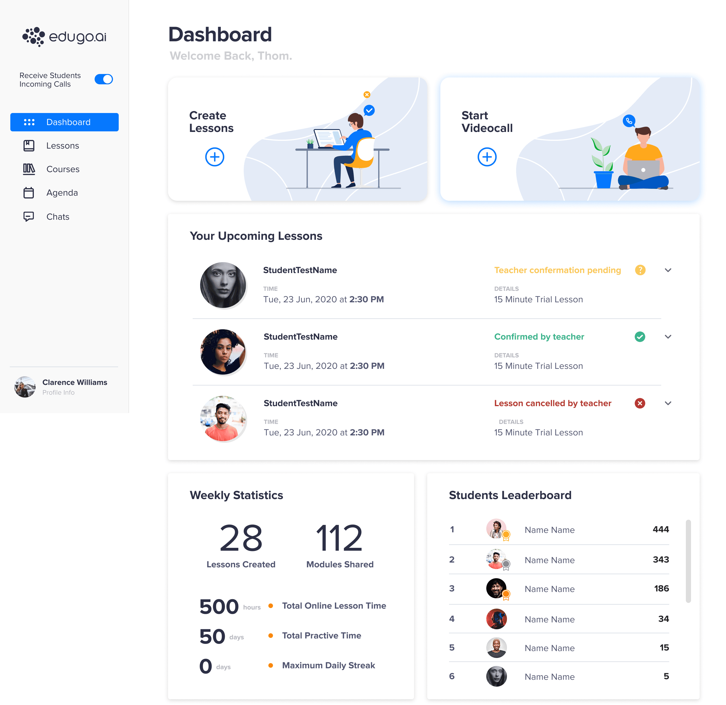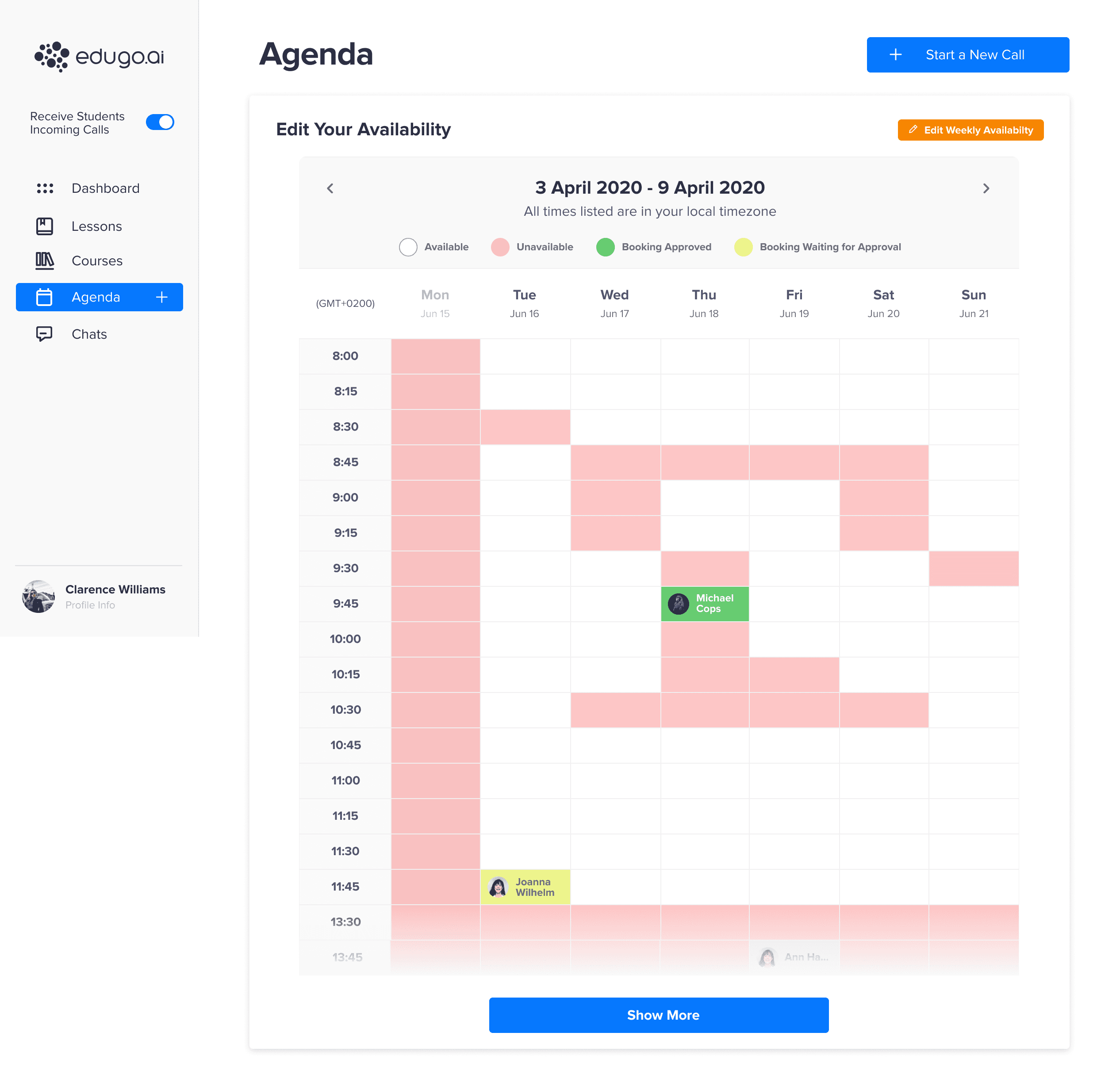 A centralized hub featuring upcoming lessons, weekly statistics, and a student leaderboard — blending operational clarity with gamification. A weekly calendar view for managing availability, tracking bookings, and overseeing upcoming lessons at a glance.