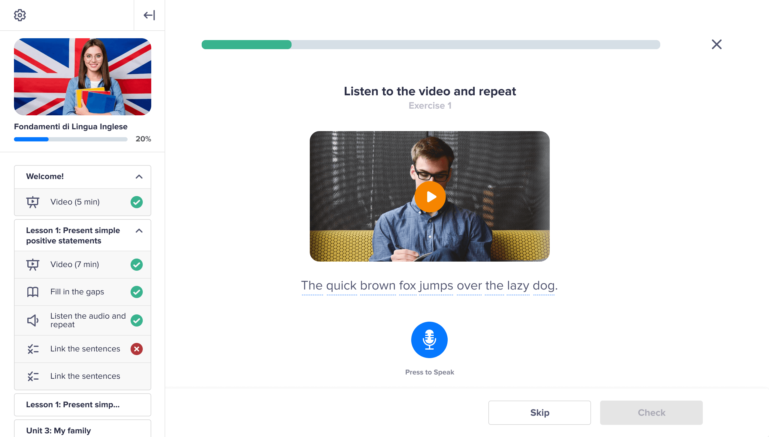 Gamified assessment experiences including listen-and-repeat, word matching, dictation, and multiple-choice exercises — designed to feel engaging rather than evaluative, with real-time feedback and level determination.