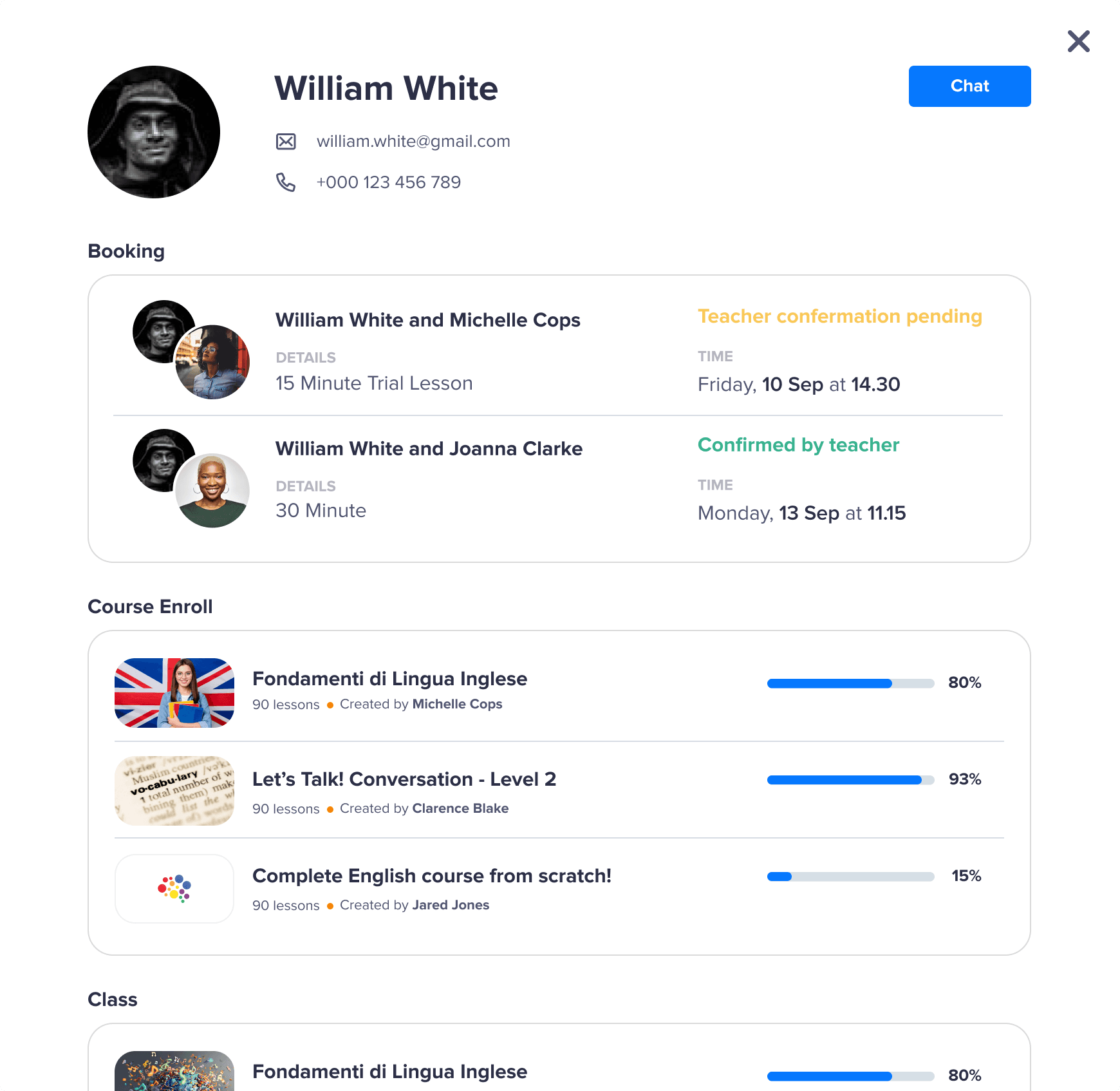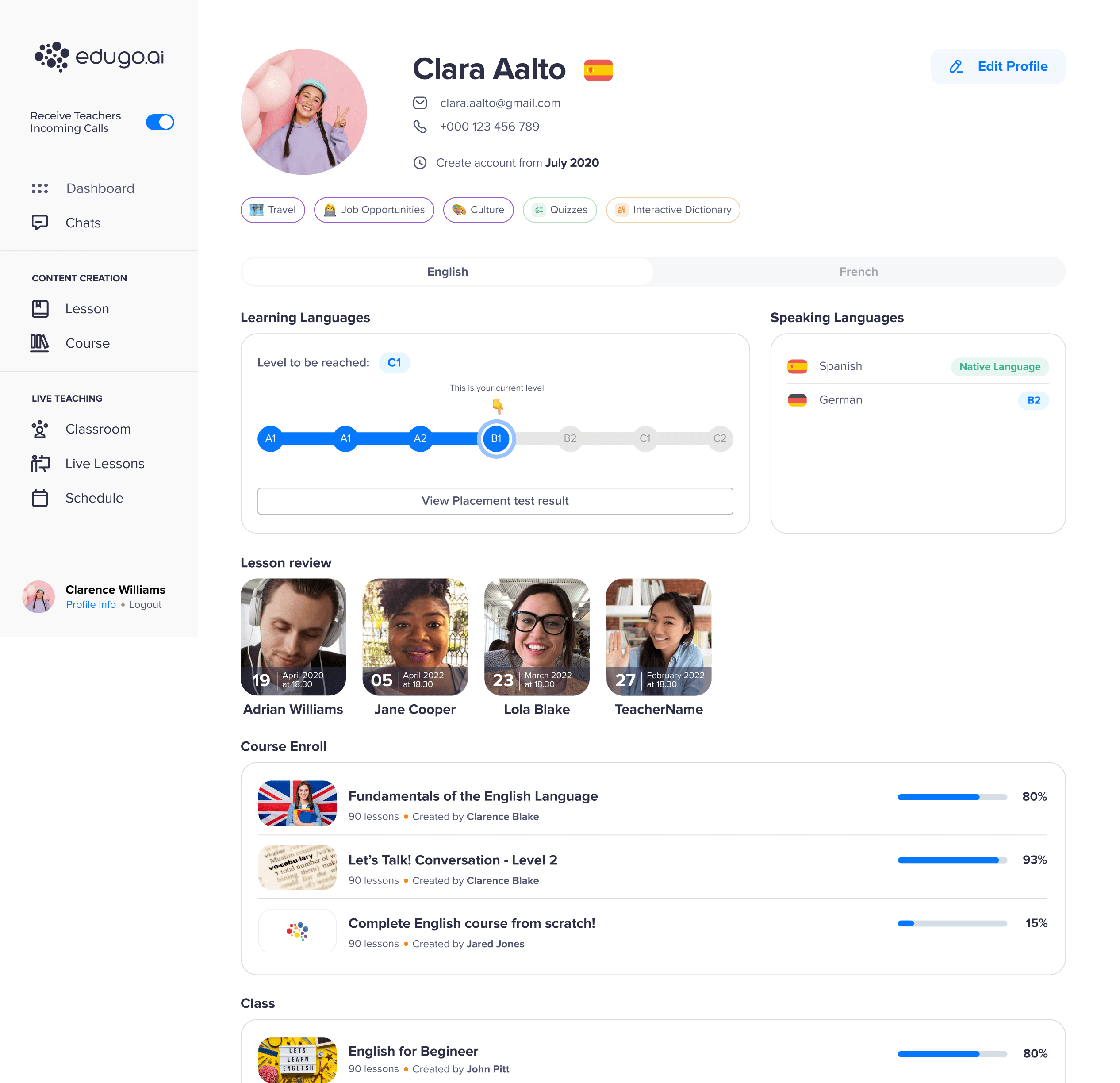 A comprehensive learner view displaying language progress, enrolled courses, lesson history, and learning goals — giving students a clear sense of their journey at a glance.